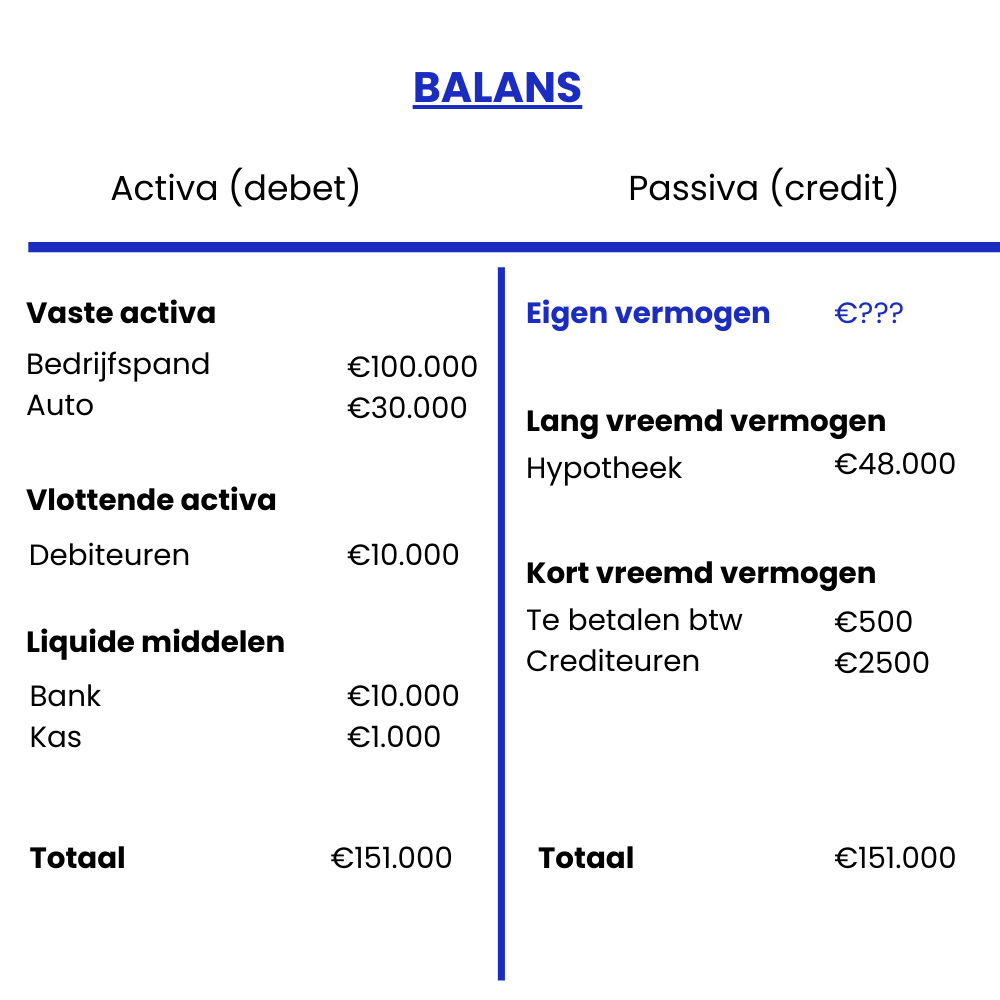 Zoals je ziet op de balans zijn de activa samen €151.000 waard. De passiva zijn €51.000 waard. Het enige missende bedrag is dan nog het eigen vermogen, dit berekenen we zo: