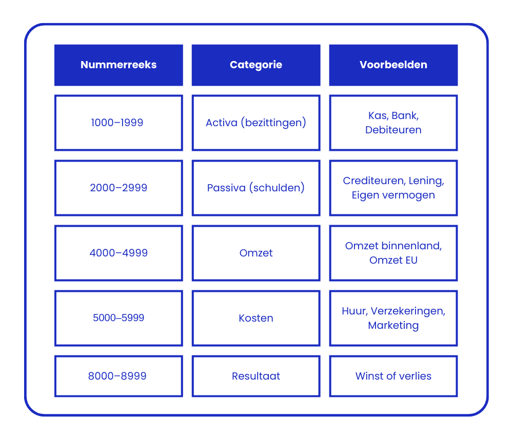 Een rekeningschema - ook wel de grootboekindeling of boekhoudstructuur genoemd - vormt de basis van je boekhouding. Het is een overzicht van alle grootboekrekeningen - ook wel categorieën genoemd - die je gebruikt om inkomsten, uitgaven, bezittingen en schulden te registreren. Denk aan rekeningen voor je kas, bankrekening, omzet of kosten zoals reiskosten of marketing, en schulden zoals crediteuren.