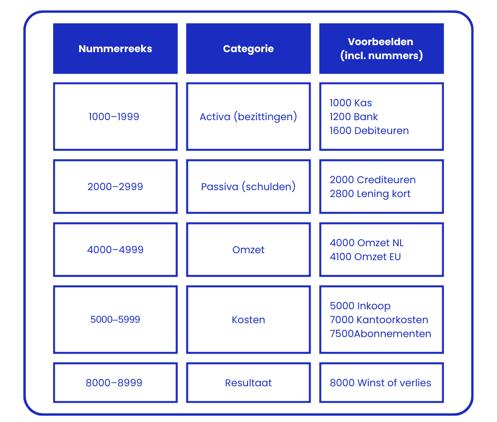 Een standaard structuur verdeelt de rekeningen in hoofdcategorieën. Zie hieronder een voorbeeld: