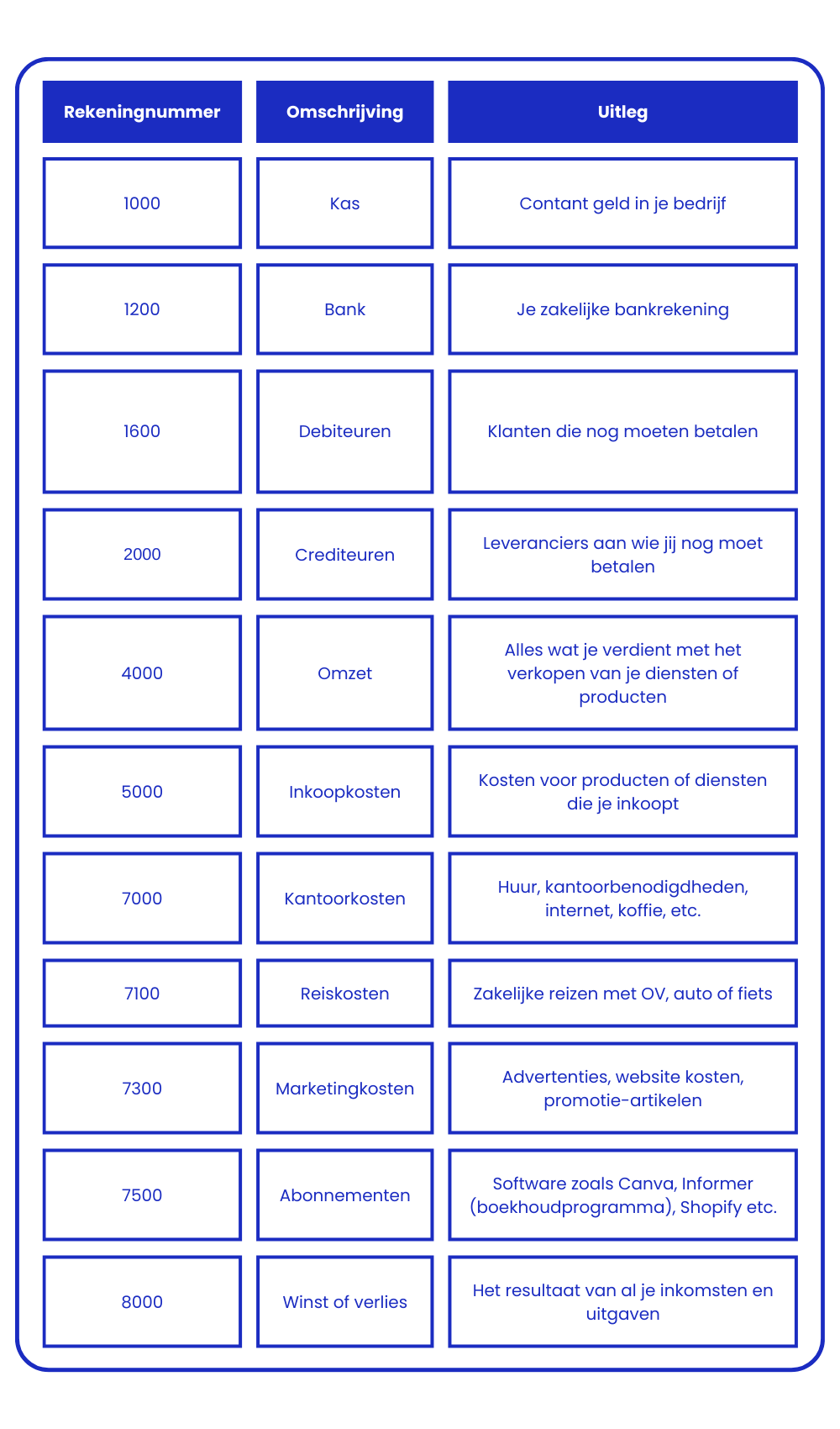 Hoe ziet zo'n rekeningschema voor zzp’ers en startende ondernemers eruit? Hieronder vind je een voorbeeld waarbij elke omschrijving wordt toegelicht met een kleine uitleg: