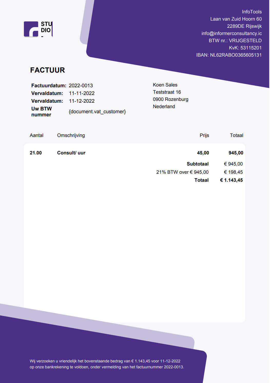 Een factuur kan je zien als een betalingsverzoek aan een klant. Een factuur is een officieel document, dit is dus niet hetzelfde als een tikkie. Aan een factuur zitten namelijk eisen die ervoor zorgen dat de factuur compleet is. In principe vertelt een factuur je klant wie, wat, hoeveel, wanneer en waar. In dit hoofdstuk vind je alles wat er wettelijk verplicht op een factuur moet staan. Zie hieronder een voorbeeld van een factuur: